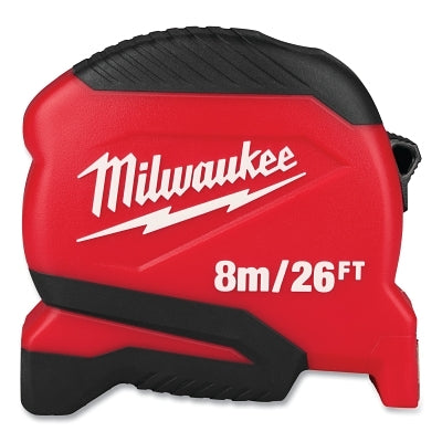 Compact Tape Measure, 8 m/26 ft, Metric/SAE, Single-Sided, Steel, Red/Black