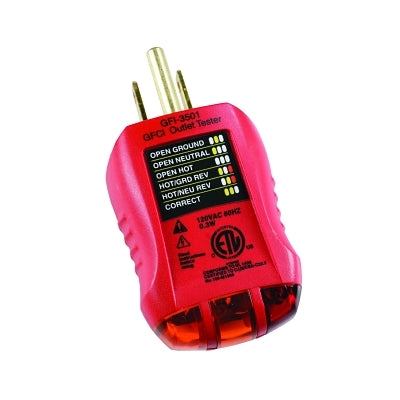 - Tests for seven conditions: ground fault interruption, open ground, open neutral, open hot, hot/ground reverse, hot/neutral reverse, and correct wiring