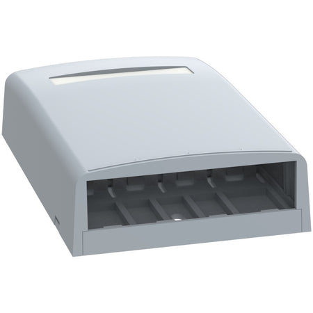 This surface mount box has a low profile design and accepts most Mini-Com modules for multimedia applications. It includes breakouts for surface raceway use and it features a quick release cover that does not require a tool. Grey