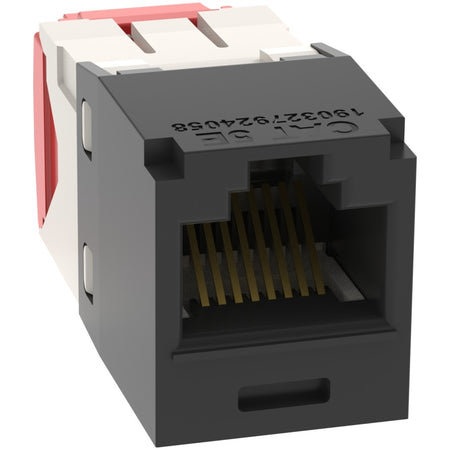 This Mini-Com TX5e TG Style UTP Jack Modules can be routed into tight spaces while maintaining proper bend radius. Angled wire caps can be applied to new or already installed compatible jacks. Black