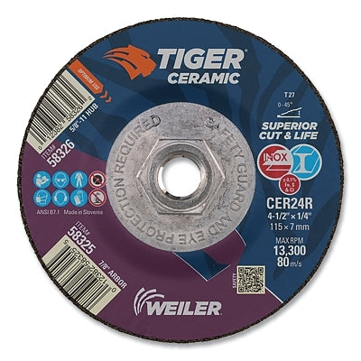 Tiger Grinding Wheel, 4-1/2 in dia x 1/4 in Thick x 5/8 in-11 Arbor, 24 Grit, Ceramic Alumina, Type 27, 10 EA/BX
