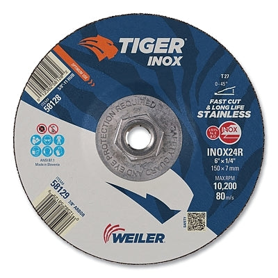 Tiger Inox Grinding Wheel, 6 in dia, 1/4 in Thick, 7/8 in Arbor, 24 Grit